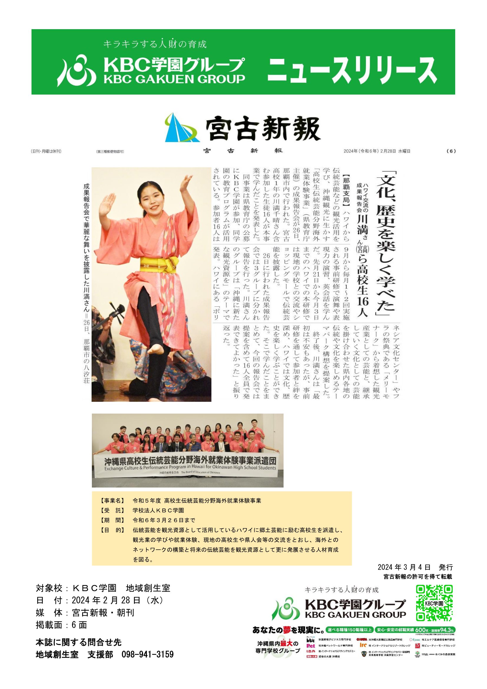 【学校情報】伝統芸能分野ハワイ研修の成果報告会が離島の新聞社に掲載!