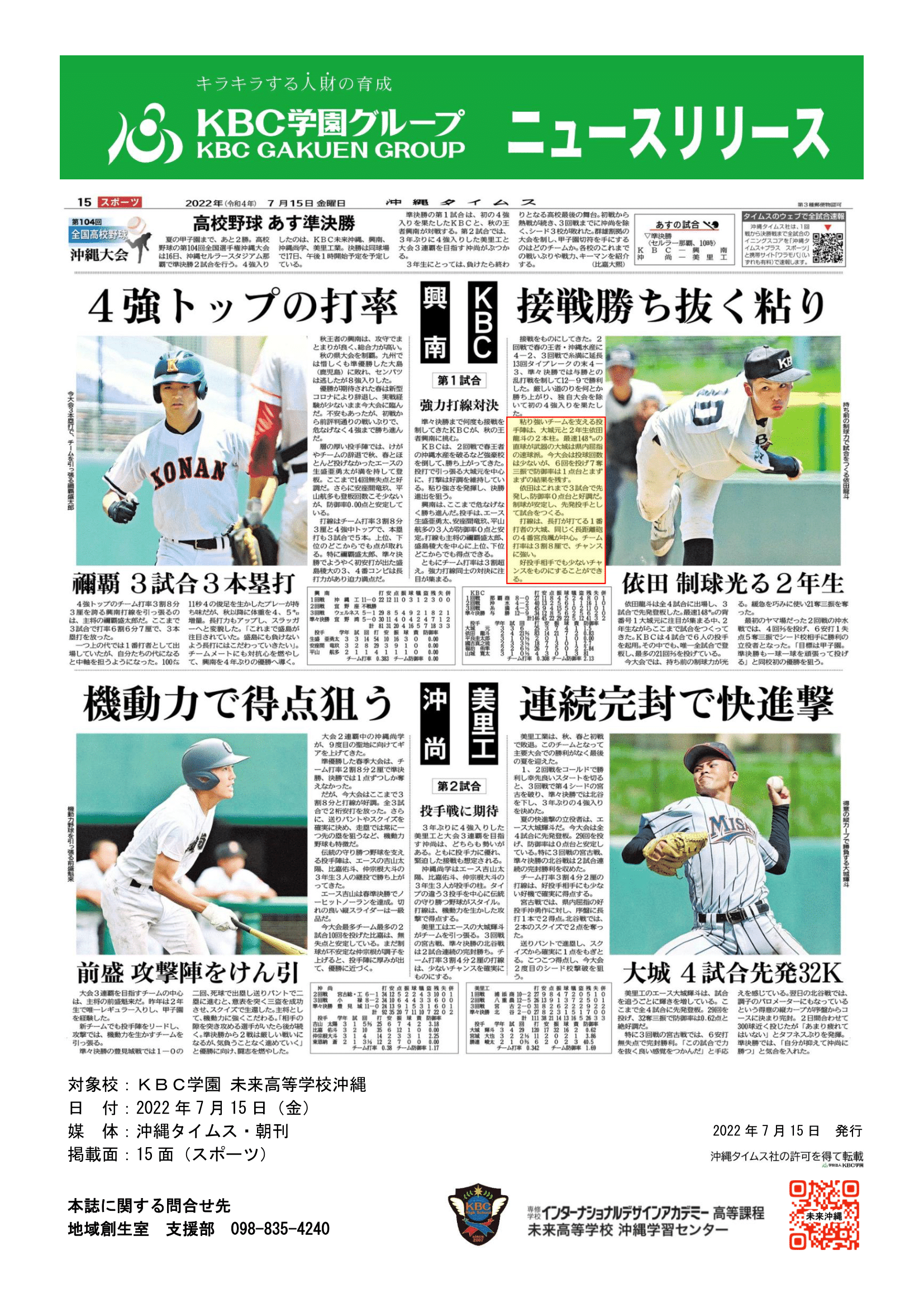 2022.07.12甲子園沖縄大会の様子が掲載されました。