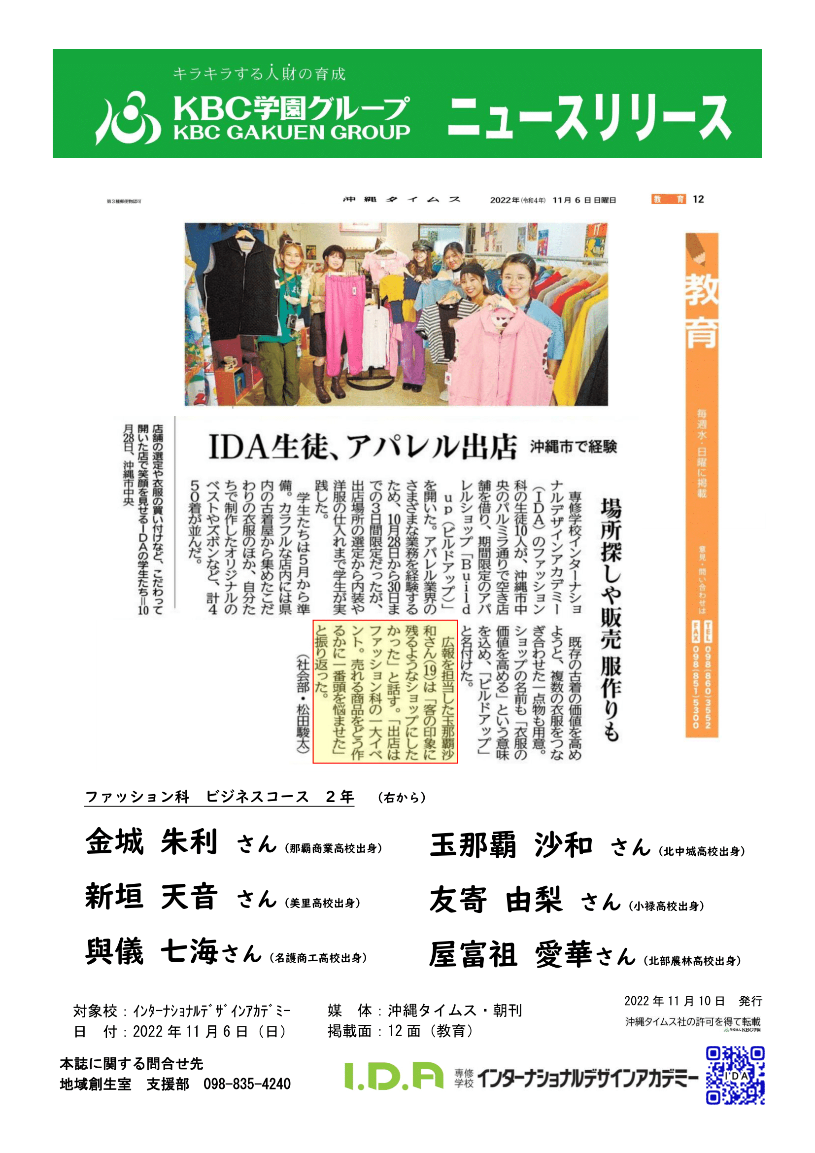 【学生情報】IDA伊東さん 浦添市より「…