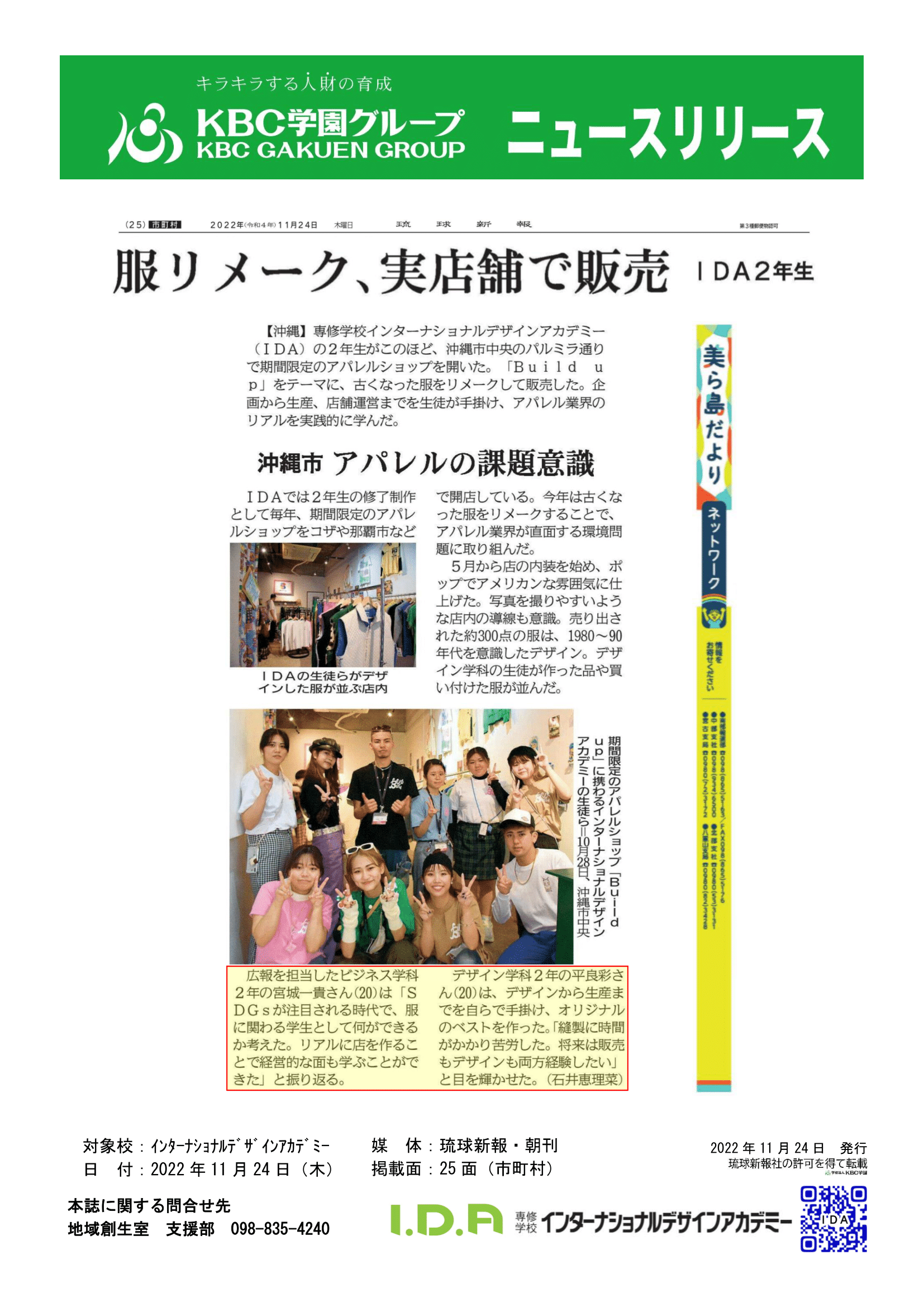 【学生情報】IDAの学生が宮古新報より取…
