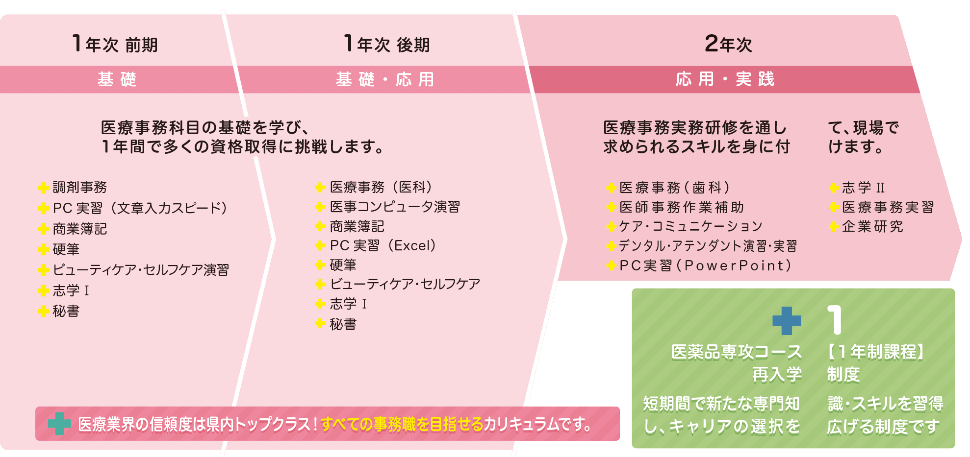 医療事務をはじめとする全ての事務職の知識・技術を幅広く学べ、患者様に寄り添った対応力を身に付けるコースです。