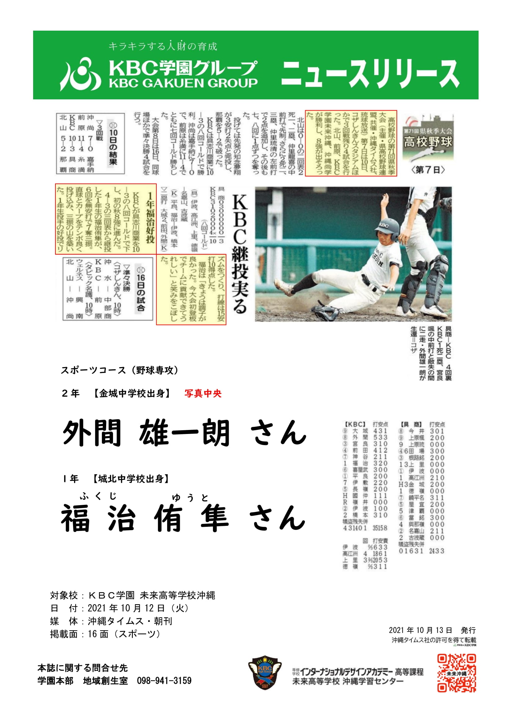 【生徒情報】KBC未来沖縄 スポーツコース(野球専攻)が大活躍!