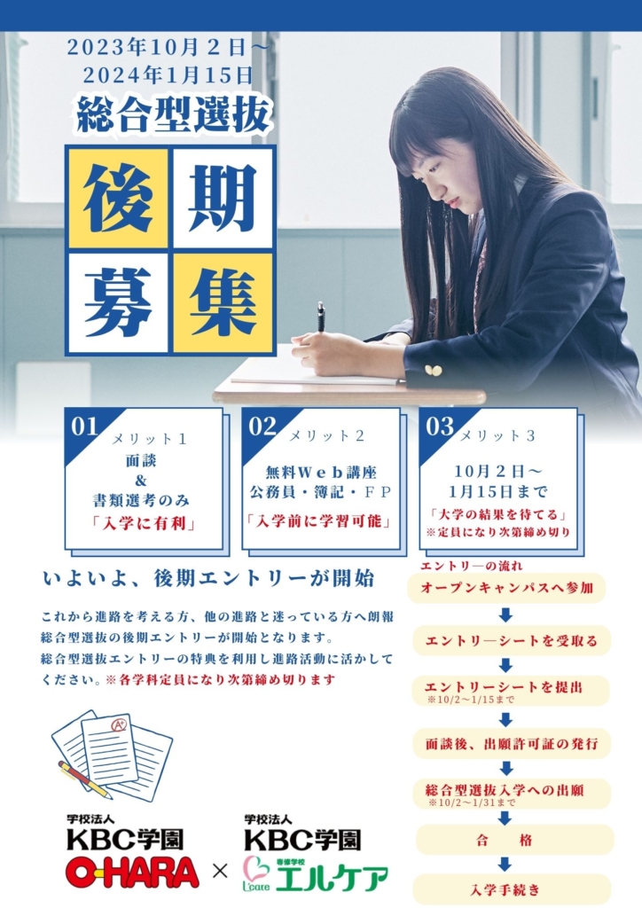 News 総合型選抜 後期募集について 2023.09.21 総合型選抜の後期募集が10月2日よりスタートします。これから進路を考える方、他の進路と迷っている方は、一度オープンキャンパスに参加をして、エントリーシートを受取ってください。 前期募集で定員になってしまう学科もありますのでLINEなどでご確認ください。 ミニオープンキャンパス予約はが簡単LINE登録がまだの方はコチラから 友だち追加の後に① 氏名(ひらがな) ②高校名(卒業者は出身高校名) ③学年 資料請求はこちらから