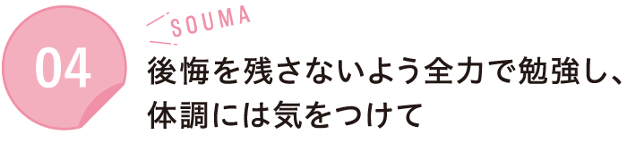 後悔しないよう、今からコツコツと勉強を始めてください。どんなに勉強したと思っても、「もっとやっておけばよかった」とならないようにする事が大切です。全力で勉強するためにも、体調に気をつけて頑張ってください。
