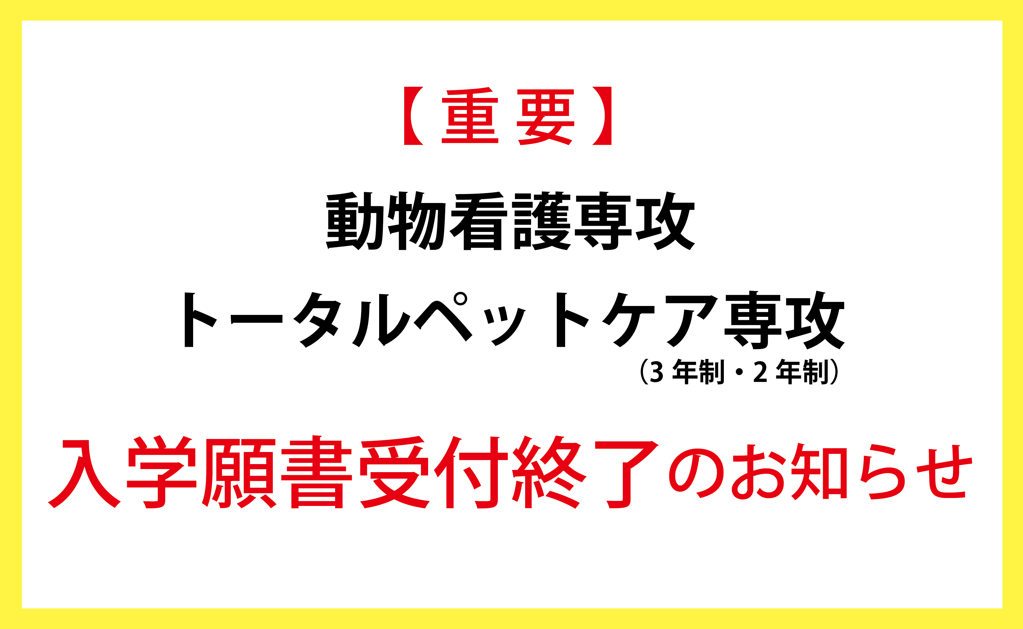 【重要】動物看護専攻、トータルペットケア専攻 入学願書受付終了のお知らせ