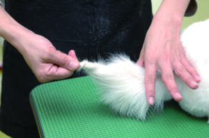 まず、犬のしっぽ(尾)の先を持ち、毛を垂らすように下に流します。