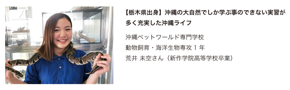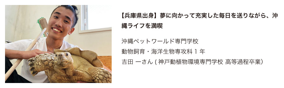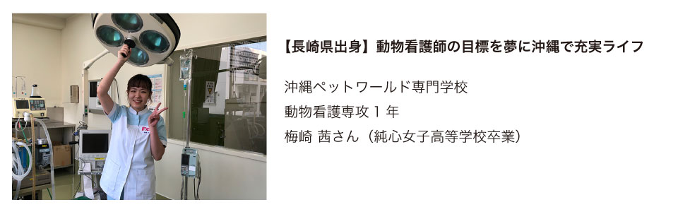 本校では、これまでも数多くの県外出身者が学んできました。その学生の多くは、地元へ戻って就職しています。沖縄ペットワールド専門学校では、就職課を中心に情報提供を行ない、インターンシップのお手伝いをするなど細かいサポートを行っています。もちろん、沖縄に残って就職している先輩達もいます。